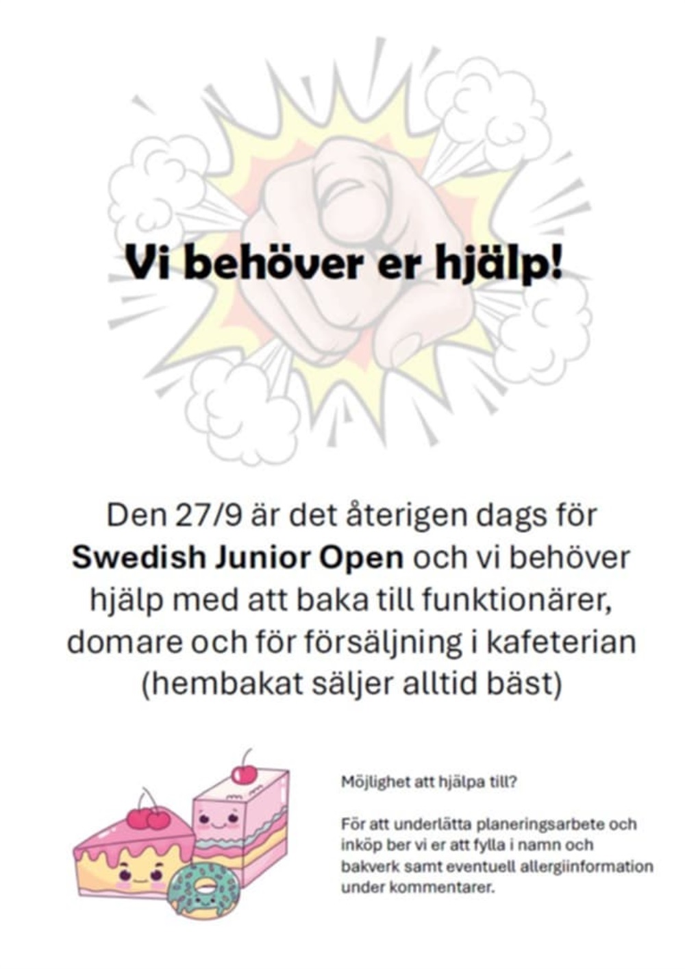På Swedish Junior Open kommer vi ha försäljning av fika. Vi behöver hjälp med bakning till kaféet.